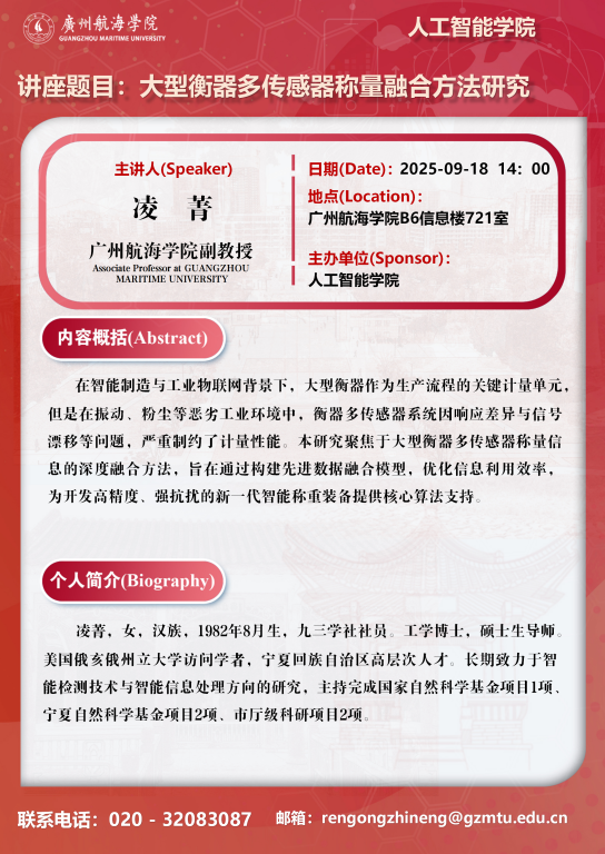 学术讲座预告:凌菁《大型衡器多传感器称量融合方法研究》
