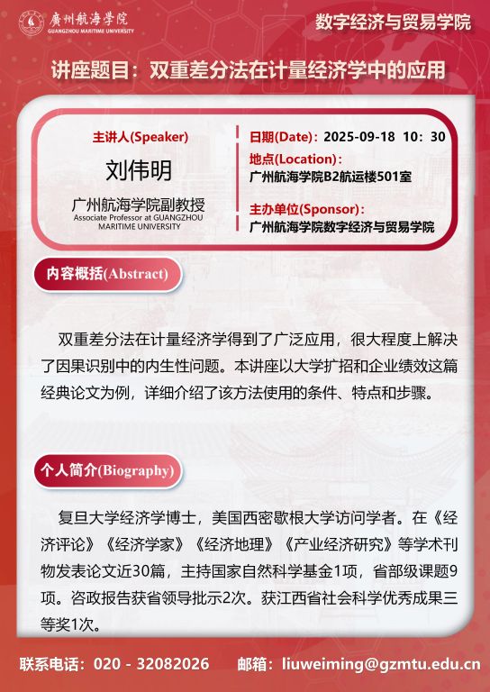 学术讲座预告:刘伟明《双重差分法在计量经济学中的应用》