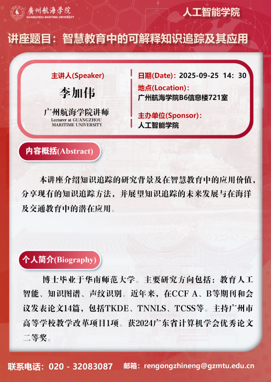 学术讲座预告:李加伟《智慧教育中的可解释知识追踪及其应用》