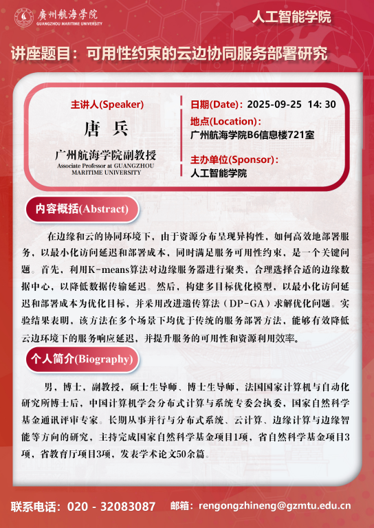 学术讲座预告:唐兵《可用性约束的云边协同服务部署研究》