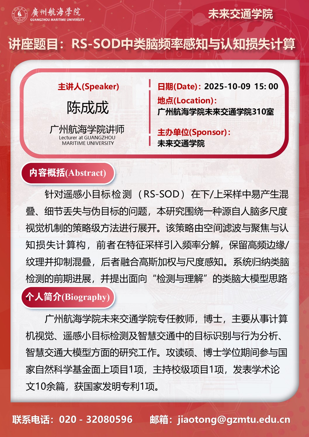 学术讲座预告:陈成成《RS-SOD中类脑频率感知与认知损失计算》