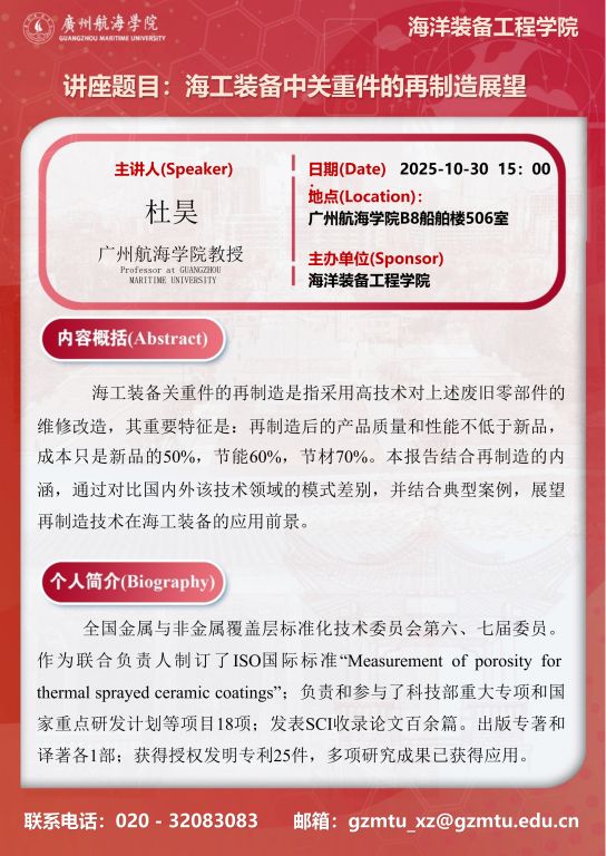 学术讲座预告:杜昊 《海工装备中关重件的再制造展望》
