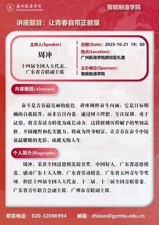 学术讲座预告:周冲《让青春自带正能量》