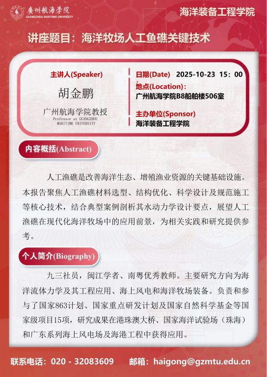 学术讲座预告:胡金鹏 《海洋牧场人工鱼礁关键技术》