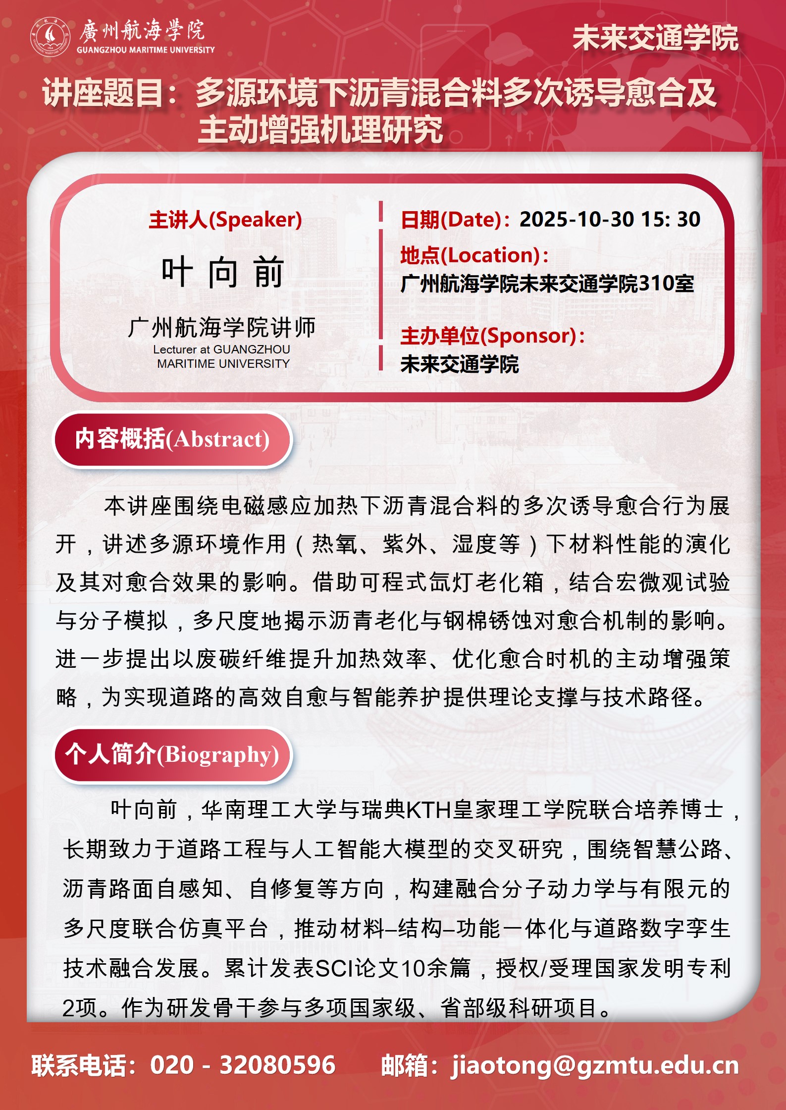 学术讲座预告:叶向前《多源环境下沥青混合料多次诱导愈合及主动增强机理研究》